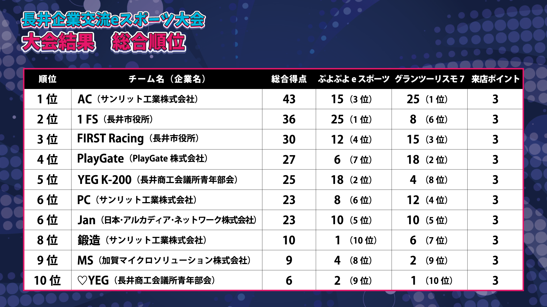 チーム順位は、各タイトルのポイントと来店ポイントの合計ポイントで決定します。